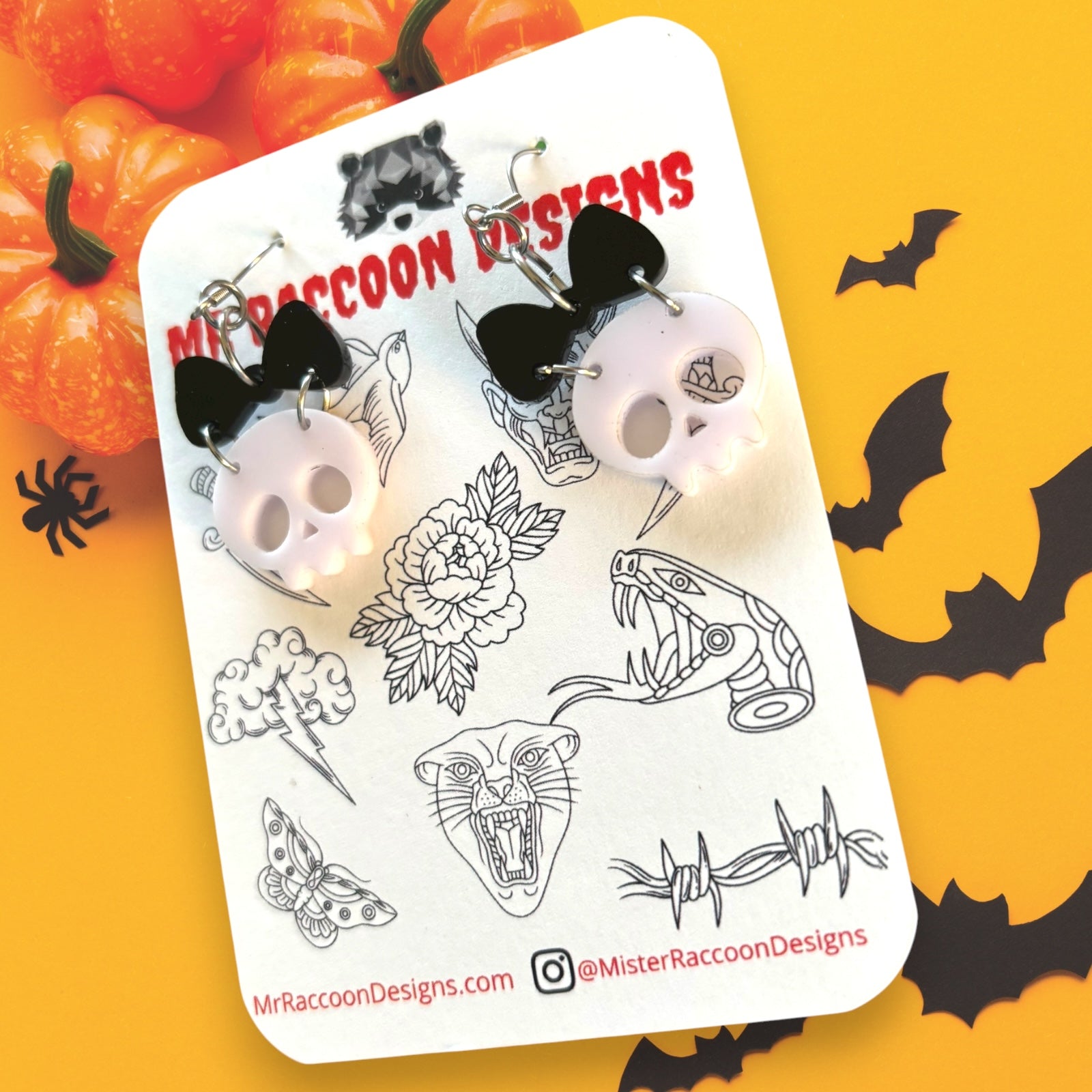• Load image into Gallery viewer, Black Bow Skulls Dangles